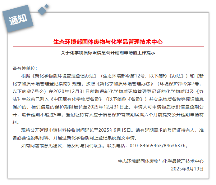 Solid Waste and Chemical Management Technology Center of Ministry of Ecology and EnvironmentNotice on the Work Reminder for the Application for Delay in the Disclosure of Chemical Substance Identification InformationTo all relevant units:According to the 'Measures for Environmental Management Registration of New Chemical Substances' (Ministry of Ecology and Environment Order No. 12, hereinafter referred to as the 'Measures') and the 'Guidelines for Environmental Management Registration of New Chemical Substances', according to the 'Measures for Environmental Management of New Chemical Substances' (Ministry of Environmental Protection Order No. 7, hereinafter referred to as Order 7), chemicals that obtained the Environmental Management Registration Certificate for new chemical substances before December 31, 2020, and those listed in the 'Catalog of Existing Chemical Substances in China' (hereinafter referred to as the 'Catalog') before the Measures took effect, and have implemented protection of identification information including substance names, have a protection period for identification information that extends to December 31, 2025, at the latest. Applicants may apply for an extension for the public disclosure of the substance identification information, with the maximum extension not exceeding 5 years. The holder of the registration certificate must submit the application materials for public disclosure extension six months prior to the expiration of the information protection period.The timeline for receiving public disclosure extension application materials has now been extended to September 15, 2025. Registration certificate holders in need of an extension should prepare necessary explanation materials and submit the application through the New Chemical Substance Online Registration System.If you have any questions or suggestions, please contact us in a timely manner. Contact number: 010-84665463/84636376.Solid Waste and Chemical Management Technology Center of Ministry of Ecology and EnvironmentAugust 19, 2025.